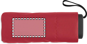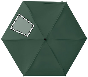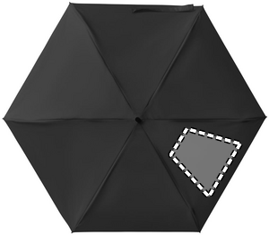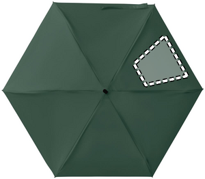 19-inch 5-fold manual umbrella made of 190T pongee with matching pouch. It has a metal and fibreglass windproof frame, black rubberized handle with wrist strap, and compact 17 cm folded size.