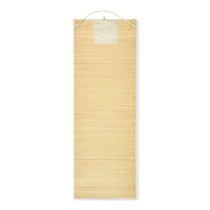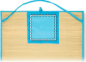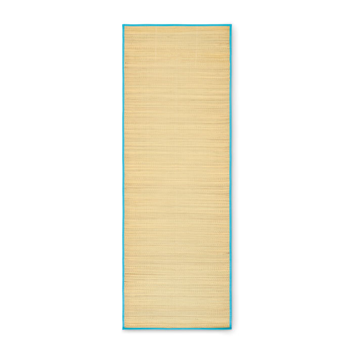 Natural straw roll up beach mat with polyester carry strap.