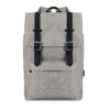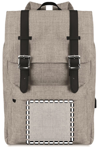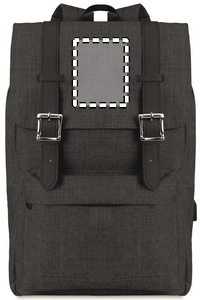 Laptop backpack in 600D 2 tone polyester with padded shoulder strap including one main internal compartment for 15 inch laptop and a USB charging cable. Includes magnetic snap button closure and one zippered front compartment.