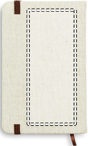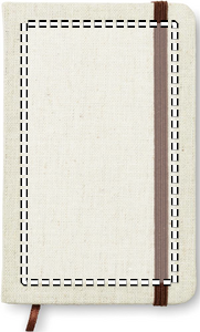 A6 notebook with hard canvas cover. Casebound. 192 lined recycled paper pages (96 sheets). Contrasting elastic closure strap and ribbon page-marker.