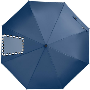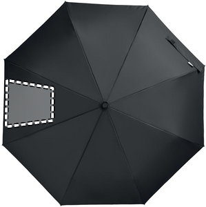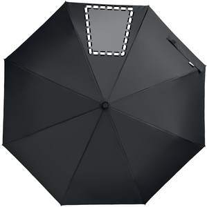 21 inch 3 fold manual open and closure windproof umbrella in 190T RPET pongee. Includes shopping bag pouch. Has hidden zippered compartment to hold umbrella and keep bag contents dry. When bag is not in use, it rolls up and zipper compartment acts as the umbrella sleeve.