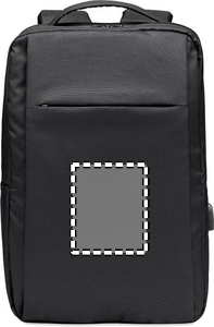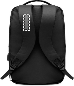 Laptop computer backpack in 300D RPET polyester including USB type-A connector and cable for charging mobile devices. This compact rucksack is ideal for traveling and work as you can bring a 16'' laptop or tablet with you in the special compartment. The different compartments are big enough to store office and travel supplies or other items for daily usage. The side compartment has an USB plug with a cable on the inside of the bag. You can connect a powerbank (not included) to this cable so you can charge your smartphone on the go without having to put it inside the bag. The adjustable padded shoulder straps ensure a comfortable fit. This recycled PET bag weighs only 334 grams when empty.