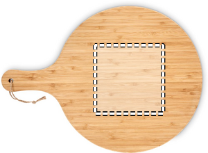 Cutting board made from bamboo wood with a convenient serving handle. Ideal for serving food and snacks during parties. Cut vegetables on it or present it as a large cheese board. With a diameter of 31cm it is large enough to also serve pizza on. When you are not using the cutting board, you can hang it up by its jute hanging cord. FSC®-certified | FSC 100%, N5.7, FSC-C213206