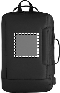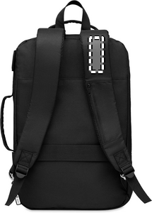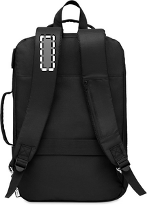 Laptop backpack in 300D RPET Polyester with padded shoulder strap including one main internal compartment for 16 inch laptop and a USB charging cable.