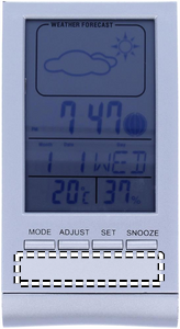 Weather station with blue LCD display. Displays weather forecast, time, date, temperature and humidity. Alarm function. 1 cell battery included.