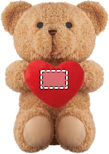Polyester teddy bear plush holding a red heart, Embroidered eyes, nose and mouth.