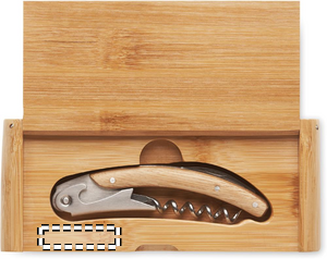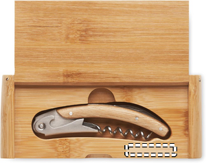 Stainless steel original waiter's knife with double corkscrew opener and bamboo surface. Presented in bamboo giftbox. Bamboo is a natural product, there may be slight variations in colour and size per item, which can affect the final decoration outcome.