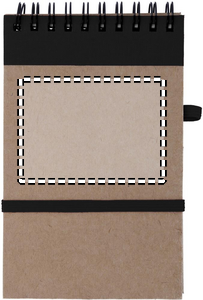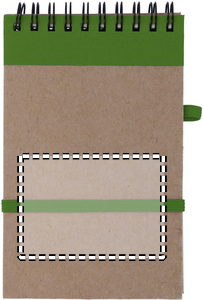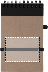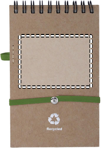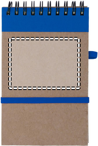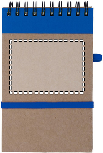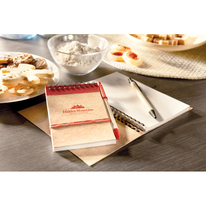 Recycled paper notebook with matching pen. Twin-wire. 140 plain recycled paper pages (70 sheets). Matching push button ball pen in recycled carton and biodegradable plastic. Blue ink. Elastic closure strap and pen holder. FSC®-certified | FSC MIX, P7.1, FSC-C213206