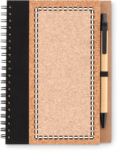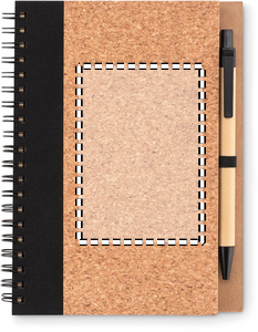 Cork notebook with pen. Soft cork cover. Twin-wire. 140 lined recyced paper pages (70 sheets). Matching push button ball pen with recycled carton barrel and corn PLA details. Black ink. Elastic pen holder. Cork is 100% natural material. Due to its structural nature and surface porosity the final print result per item may have deviations.
