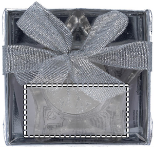Star shaped glass tea light candle holder in silver box with transparent cover and decorative ribbon. Tea light included.