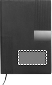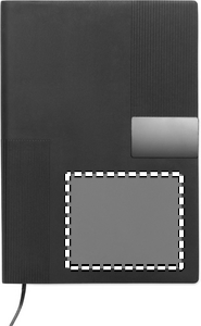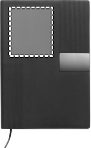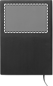 A5 PU notebook with soft cover. Casebound. 160 lined recycled paper pages (80 sheets). Matching elastic band and ribbon bookmark. Metal detail on the front.