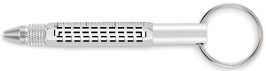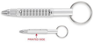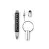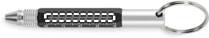 Key ring with twist action pen in recycled aluminium with 4cm/ 1,5 inch ruler, stylus and 2 in 1 phillips and flat head screw driver. Black ink.
