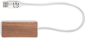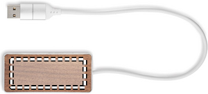 4 port USB hub in recycled aluminium case and walnut top detail. Output: 2 x Type-A and 2 x Type-C. Input: 2-in-1 Type-C and Type-A. Cable length: 27.5 cm.