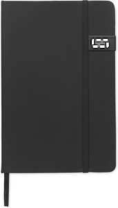 A5 notebook in hard cover made of 58% recycled polyester and 42% PU including integrated 16GB USB stick. Casebound. 160 lined recycled paper pages (80 sheets). Matching elastic closure strap and ribbon page-marker. FSC®-certified | FSC MIX CREDIT, P7.1, FSC-C213206