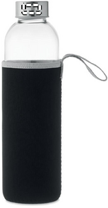 Glass bottle (750ml) with neoprene pouch. This large capacity bottle will help you stay hydrated throughout the day. The neoprene pouch makes it easy to hold and gives extra personalisation options. Not suitable for carbonated drinks. Leak free.