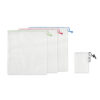 Set of 3 RPET mesh bags in RPET pouch. Reusable fruit or vegetable bags as an alternative for plastic bags. Drawstring closure. Washing machine-friendly, BPA free and food-safe.