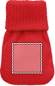 Hand warmer in knitted polyester. Includes instant heat pad in PVC to be activated by pressing the metal plate inside. Reusable by placing pad in hot water.