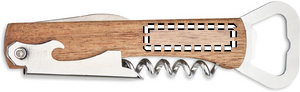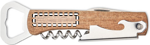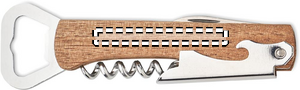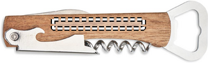 3 in 1 bottle opener in acacia wood case. It includes a corkscrew, 2 bottle openers and foil cutter.